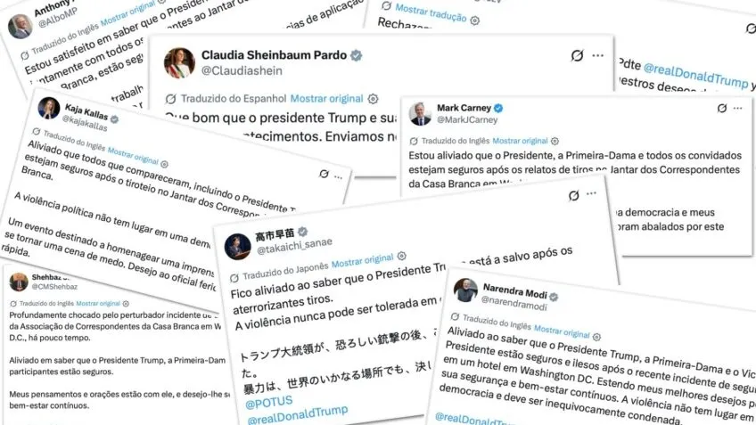 <p>Autoridades de diversos países se manifestaram nas redes sociais após o ataque ocorrido durante um evento com o presidente dos Estados Unidos, Donald Trump, neste sábado (25) em Washington. O episódio, registrado durante o tradicional jantar com jornalistas, provocou a retirada imediata do republicano e mobilizou forças de segurança.</p>